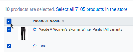 Press the square in the upper left corner, thereby selecting all products on the relevant page. There will then be an option to select all products.