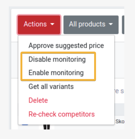 When the desired products have been selected, under 'Actions' at the top, there will be an option to switch monitoring on or off.