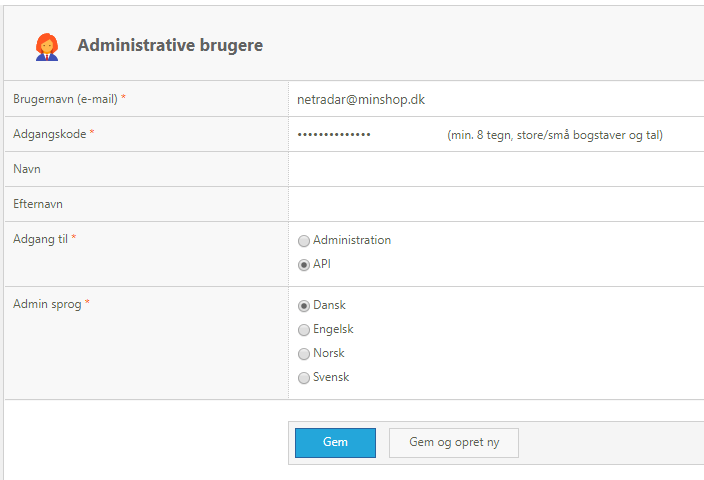 Enter an email address and password. If you do not have an e-mail address that is not already used for another user account, you can write a fictitious one. At 'Access to', select 'API'. Then click 'Save'