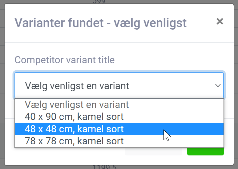 First, the current competitor must be added to the product – via automatically found or manually added . If you add manually, wait 5-10 minutes after the link has been inserted before you check further about variants (options on the page must be downloaded first).